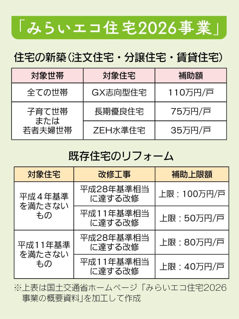 「みらいエコ住宅2026事業」対象住宅に最大110万円を補助