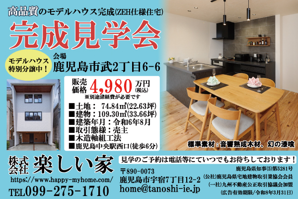 楽しい家では、鹿児島中央駅エリアの鹿児島市武にて、ZEH仕様住宅高品質のモデルハウス完成見学会を開催。