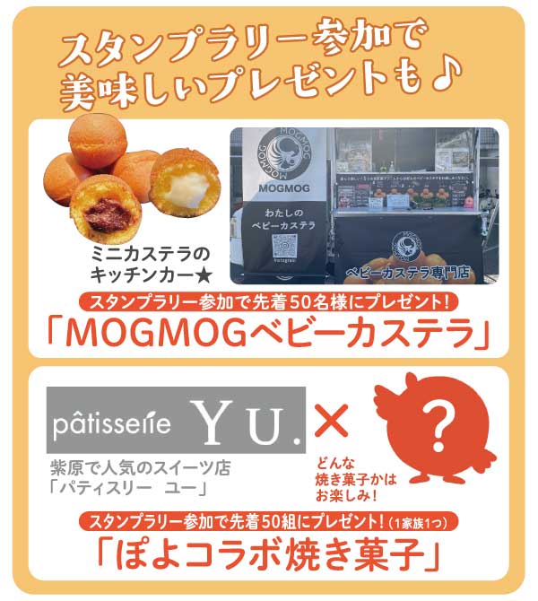 スタンプラリー参加で、先着50名にミニカステラキッチンカー の「MOGMOGベビーカステラ」とパティスリー ユーの「ぽよコラボ焼き菓子」をプレゼント!(1家族1つ)