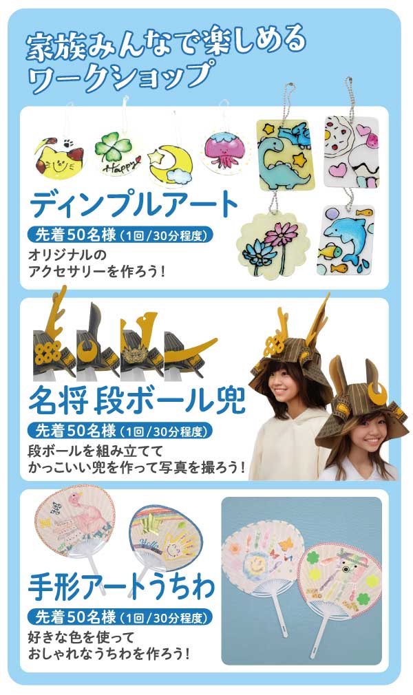 ほかにも、家族みんなで楽しめるワークショップも盛りだくさん!ディンプルアート、段ボール兜作り、手形アートうちわ作りなど先着で参加できますよ。